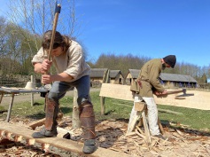 Im Laufe des Jahres werden sie direkt am Wallsee inmitten unserer Handwerkersiedlung den Kiel und die Steven mit Äxten aus dem vollen Holz formen. Vor den Augen der Besucher werden die Planken gehauen, Spanten zugerichtet, Bootsteile geteert und natürlich alles nach und nach geteert, kalfatert und zusammengesetzt.